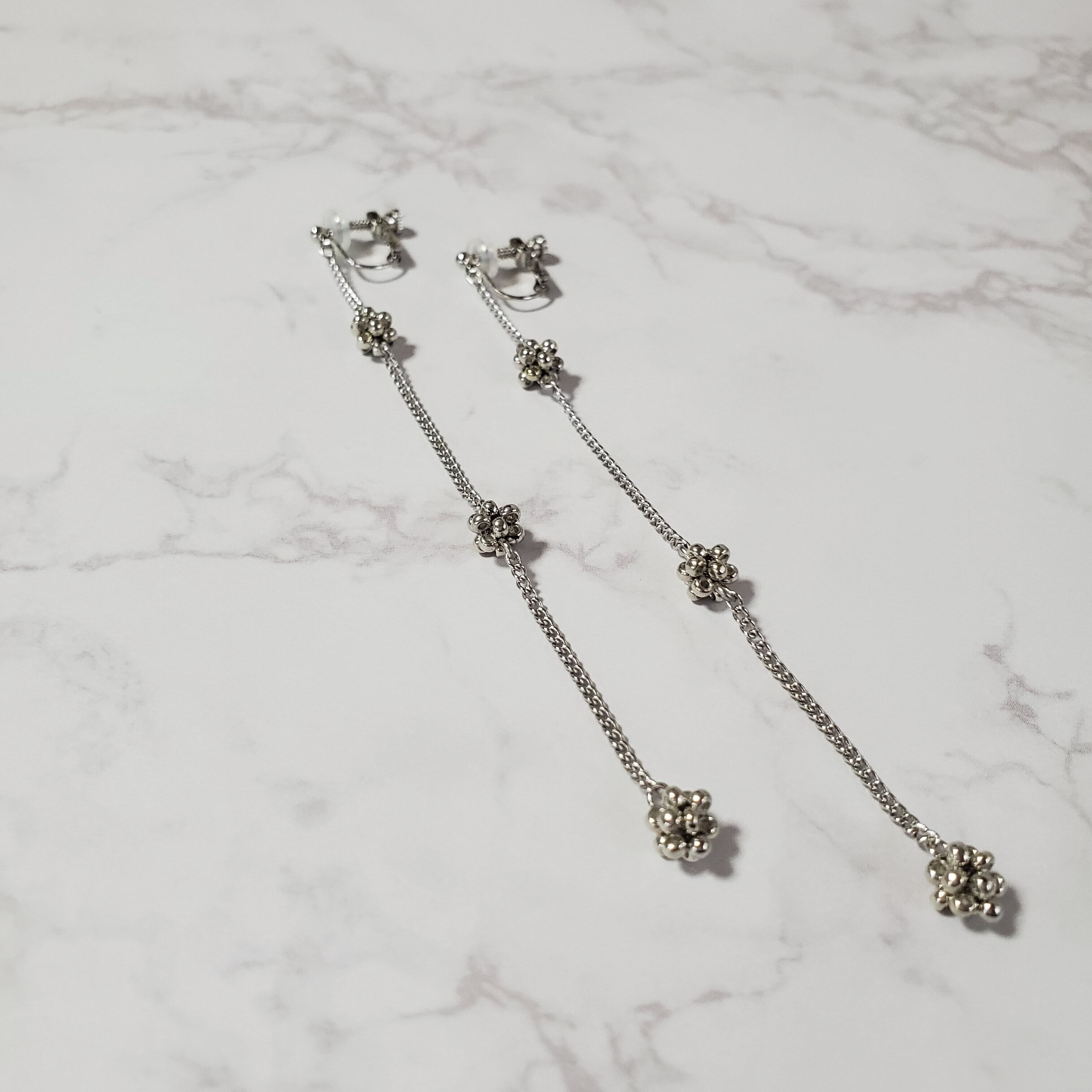 〈たま結び〉 銀色ビーズのたま結びがついた耳飾り 仕様 (ピアス、イヤリング金具含めて)長さ 約11cm 金具シルバーカラー ピアス: 真鍮キャッチ イヤリング: ネジバネ式 シリコンカバーつき 材質 丸小ビーズ【カラー: 銀色】 鉄チェーン